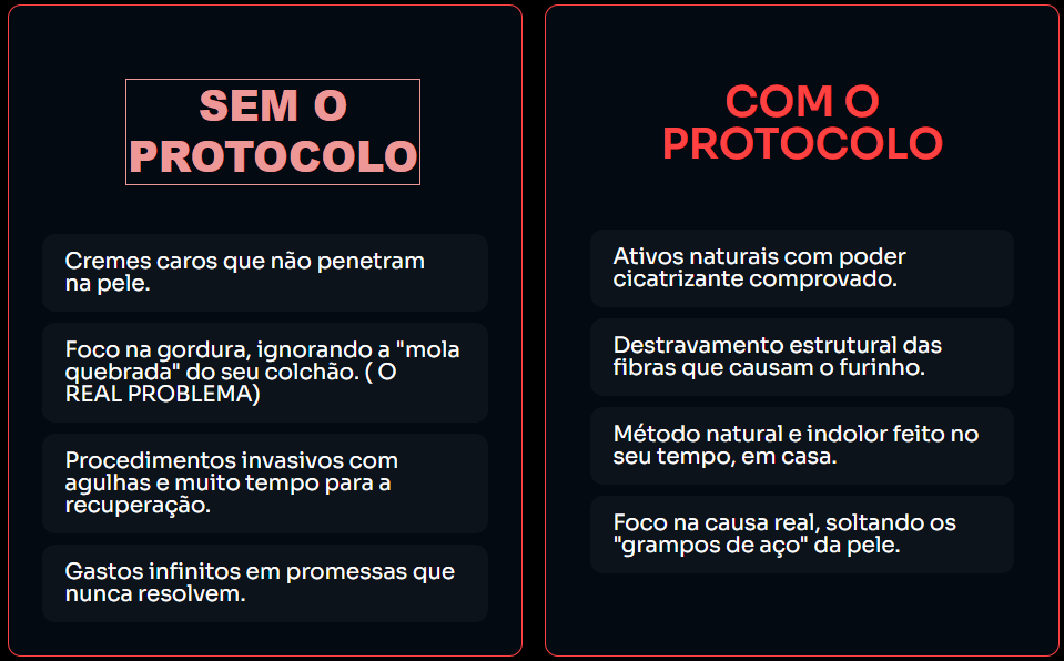 O maior benefício é o ataque direto às “travas” que causam os furinhos. Enquanto métodos comuns tentam apenas queimar gordura, este protocolo utiliza estímulos mecânicos para soltar os septos fibrosos que puxam a pele para baixo, resultando em uma superfície visivelmente mais lisa e uniforme.